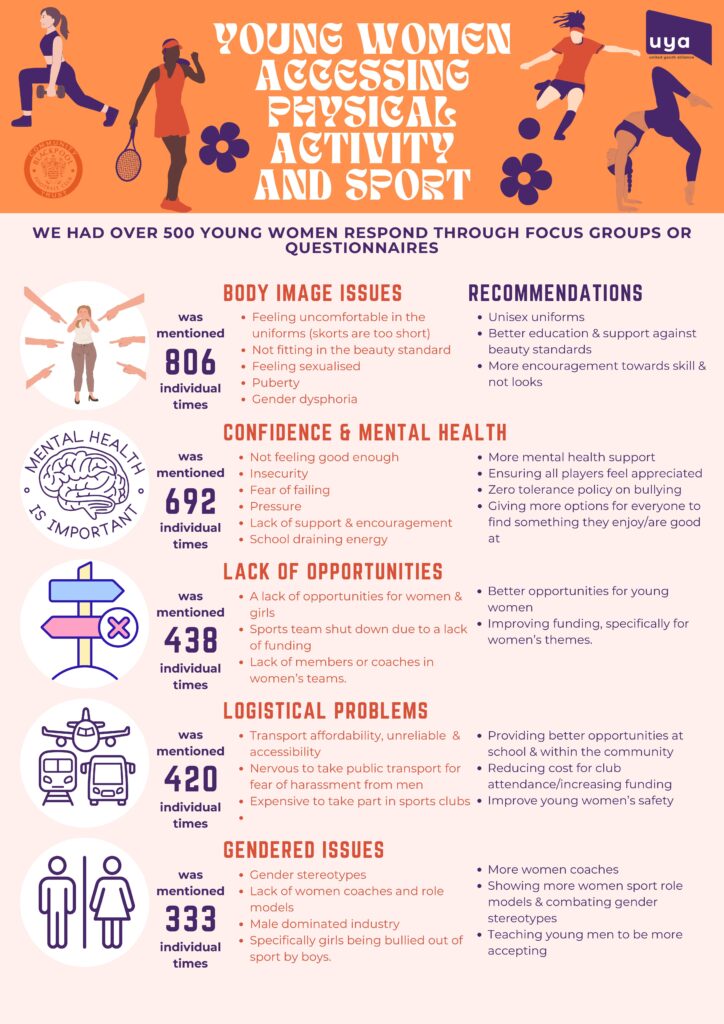 Two further themes surfaced during the youth engagement process: the lack of women-only opportunities and the poor visibility of available activities. These observations underscore a compelling need for targeted interventions. Quantitatively, the analysis of young women’s voices confirmed the urgency of these challenges, as body image and mental health concerns were frequently cited. Additionally, the findings reflect a crucial need for reframing physical activity perceptions and address the ongoing impacts of the COVID-19 pandemic on structured activity engagement.